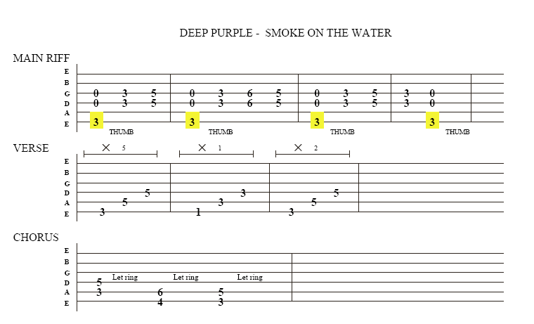 Ritchie Blackmore uses his thumb on the highlighted yellow notes for Deep Purple classic smoke on the water . If you don't like the use of the thumb , then ignore the yellow boxes and it will still sound fine !
